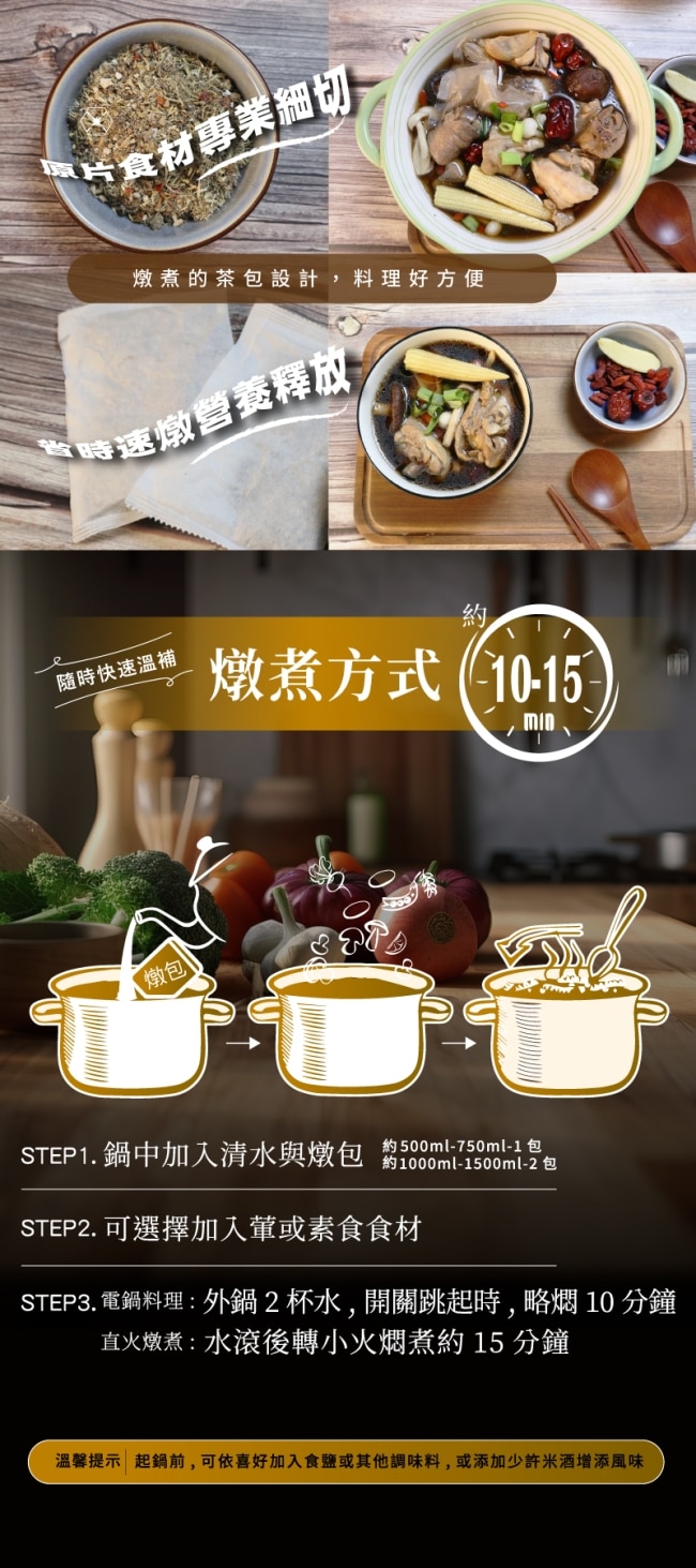 是一款方便又營養豐富的燉煮食材只需將30克的燉包加入500至750毫升的水中