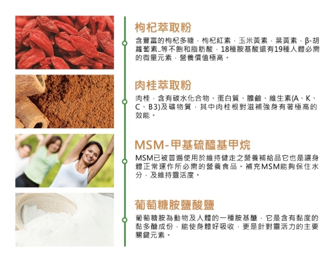 商品成份複方土龍粉末(含土龍山藥黨篸黃耆茯苓) 、靈芝子實體萃取粉(靈芝子實體萃取物(Ganodermalucidum (Leyss. : Fr.) Karst.固態培養)、麥芽糊精)、黃精萃取粉(黃精萃取物、麥芽糊精)、枸杞萃取粉(枸杞萃取粉、麥芽糊精)、肉桂萃取粉(肉桂萃取物、麥芽糊精)、甲基硫醯基甲烷(MSM) 、葡萄糖胺鹽酸鹽、麥芽糊精、微晶纖維素。(膠殼部份明膠、硫酸月桂脂納、純水、二氧化鈦、甘油、食用紅色六號、食用黃色五號、食用藍色一號)