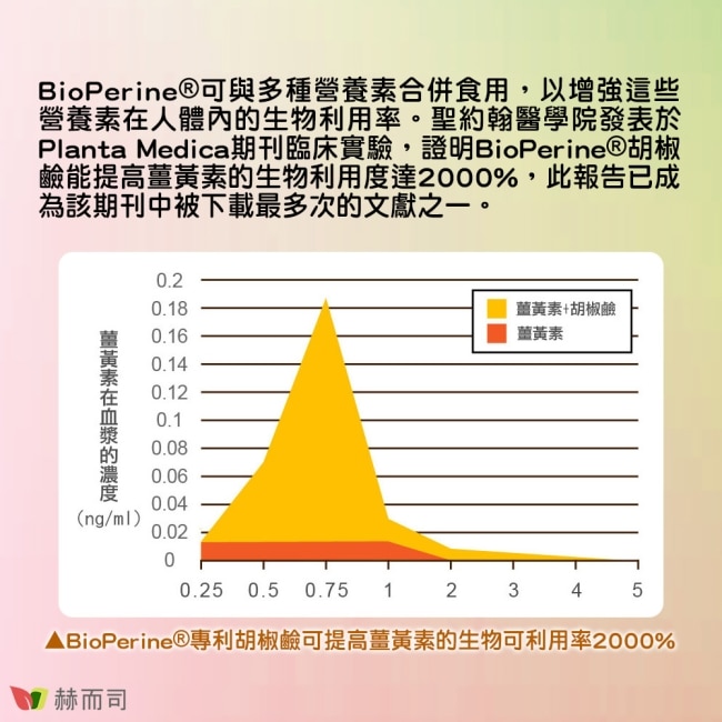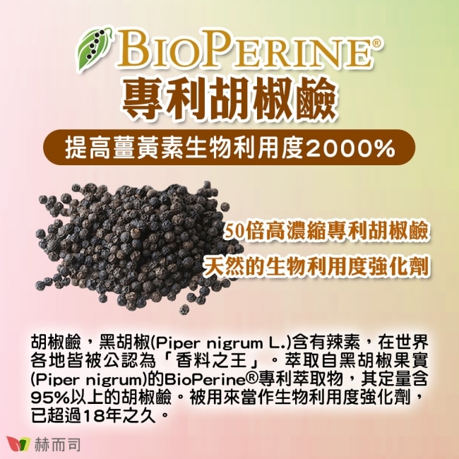 搭配BioPerine 50倍高濃縮專利胡椒鹼能提高薑黃素吸收率高達2000%