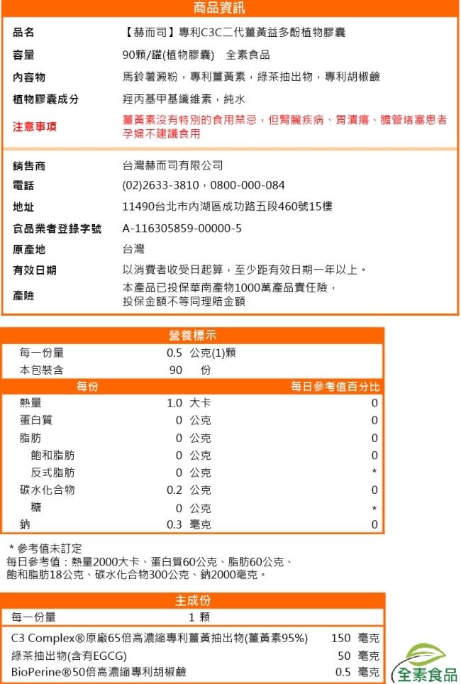【赫而司】二代專利薑黃益多酚全素食膠囊(90顆*2罐)(含高濃縮95%專利C3C複合薑黃素+胡椒鹼+EGCG)