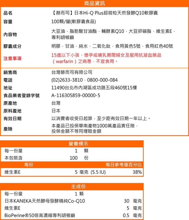 赫而司二代【Hi-Q Plus】日本KANEKA發酵Q10軟膠囊(100顆*1罐)超微粒Q10輔酵素+胡椒鹼抗氧化養顏美容青春活力