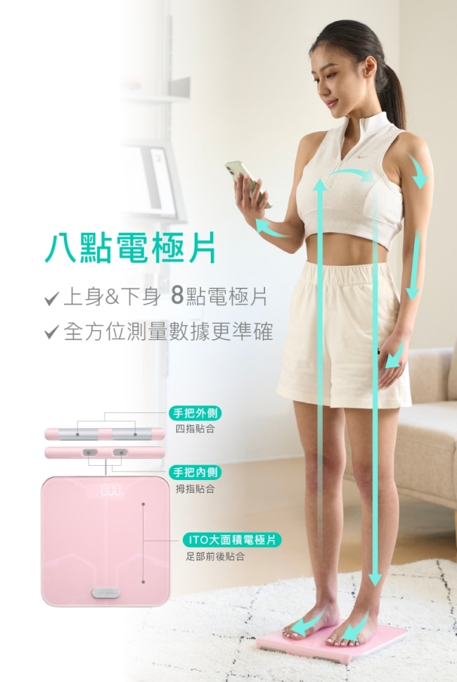 1. 8個電極片精準傳輸資料、監測全身數據上下身分段測量更準確擁有和專業體脂計同樣規格