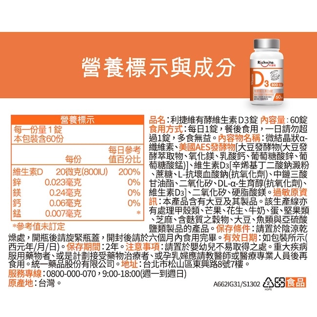 2.商品品名利捷維有酵維生素D3錠 60錠