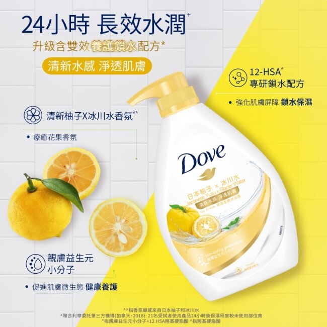 清新柚子X冰川水香氛清新水感 淨透肌膚 添加親膚益生元小分子配合12-HSA專研鎖水配方*與皮膚共同作用強化肌膚屏障由內到外看得見的幼嫩水潤