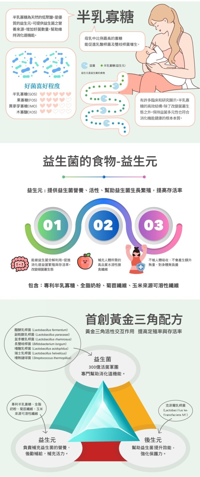 • 黃金三角配方結合益生菌、益生元與後生元提升消化道菌叢平衡與活性。