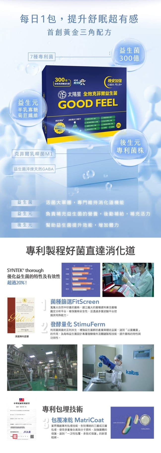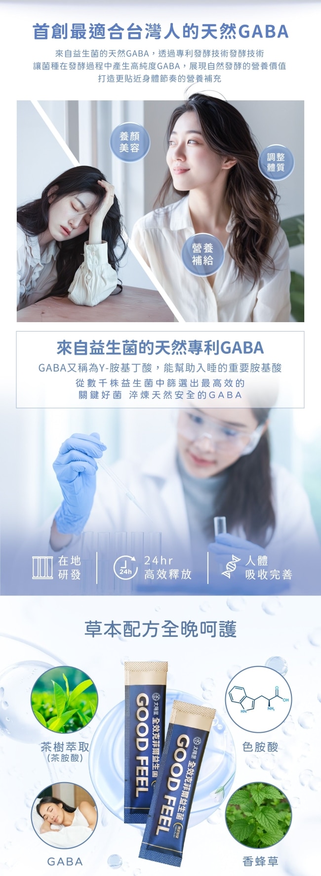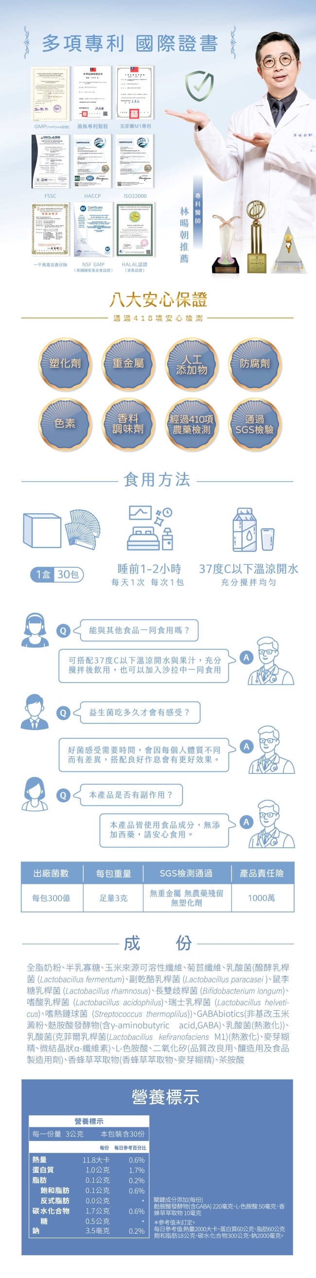 | 商品簡述 | 台灣首支由益生菌提取的天然GABA、專利包埋技術好菌直達腸道、獨特後生元-克菲爾乳桿菌M1添加 |