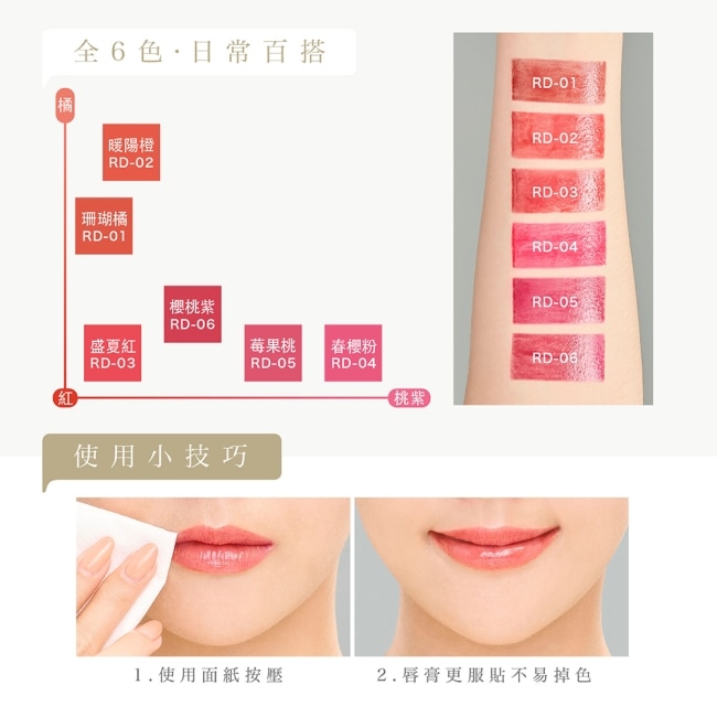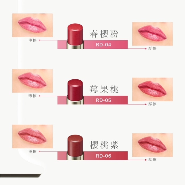 | 商品簡述 | 帶透明感的 紅 明亮臉龐印象 柔和血色感與滋潤長效持久 高實用性的紅色系澄透唇膏 |