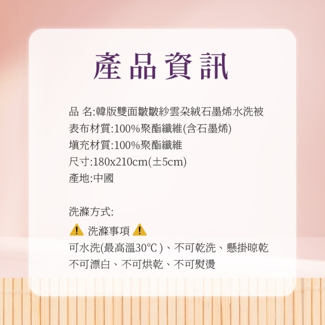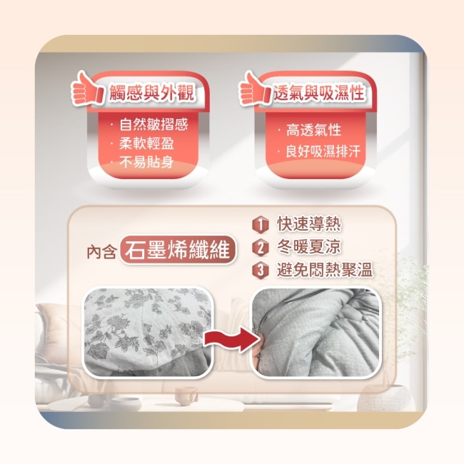 商品簡述雙面親膚皺皺紗雲朵般蓬柔觸感一蓋就愛上的石墨烯水洗被