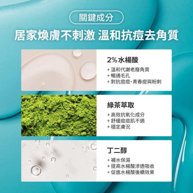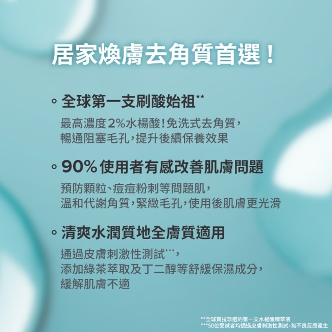 品牌熱銷NO.1免水洗去角質精華專為粉刺痘痘及毛孔困擾設計蘊含高濃度2%水楊酸溫和去除老廢角質暢通毛孔阻塞對抗痘痘粉刺打造細緻光滑水煮蛋肌。
