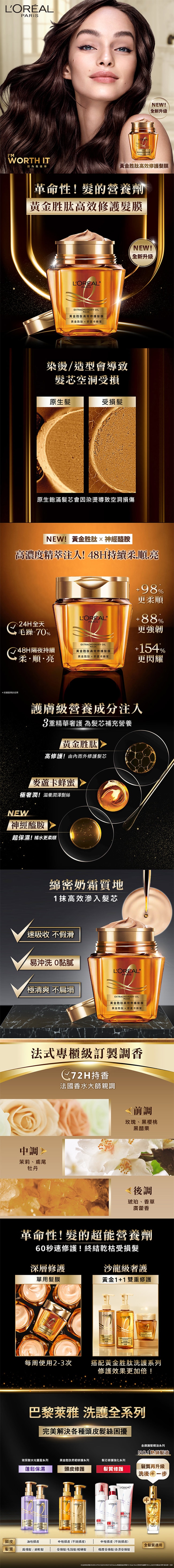 | 商品簡述 | 黃金胜肽髮膜3重奢護成分補充髮芯營養極致修護48小時柔、順、亮 |