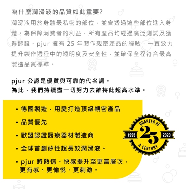 擠出適量塗抹於需要潤滑的部位pjur 的水性配方幾乎可以完全被皮膚表層吸收。 如果塗抹過多只需用水洗淨即可。