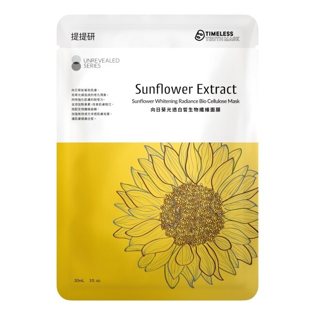 向日葵芽萃取能幫助肌膚抵禦光線造成的老化現象,同時強化肌膚的耐受力,並添加熊果素,改善肌膚暗沉,搭配生物纖維面膜,加強有效成分效果,讓肌膚健康白皙。