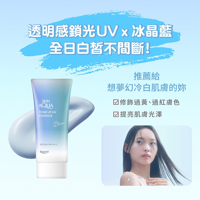 以透明藍調及光透白色交織出的冰晶藍色調能修飾紅潤膚色,