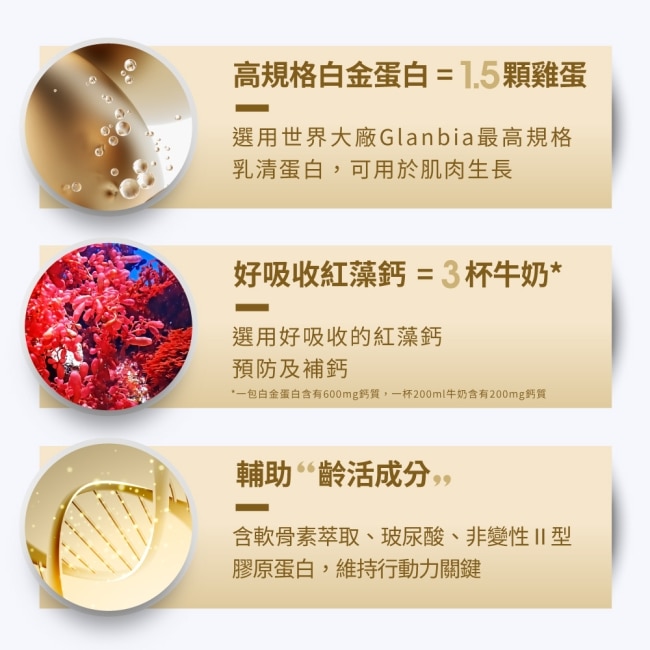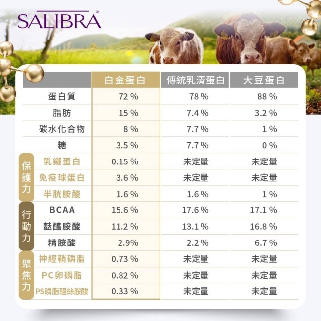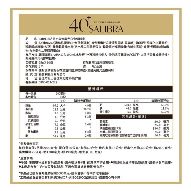 4.內容物成分Salibra 702 (濃縮乳清蛋白、大豆卵磷脂)、麥芽糊精、短鏈低聚果糖(果寡糖)、海藻鈣、磷脂醯絲胺酸(大豆)、雞胸軟骨抽出物(含水解二型膠原蛋白、軟骨素)、啤酒酵母(含維生素D)、食鹽、雞胸軟骨抽出物(含非變性二型膠原蛋白)