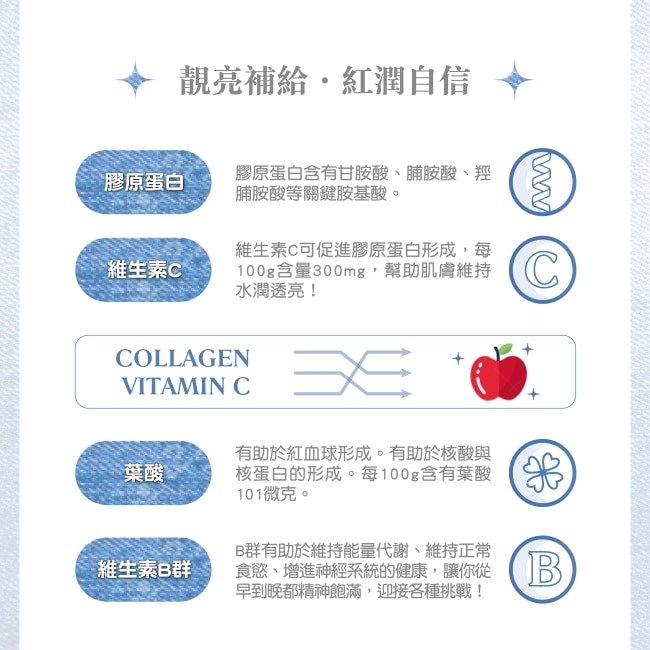 3.膠原蛋白 : 添加膠原蛋白配方維持好氣色。