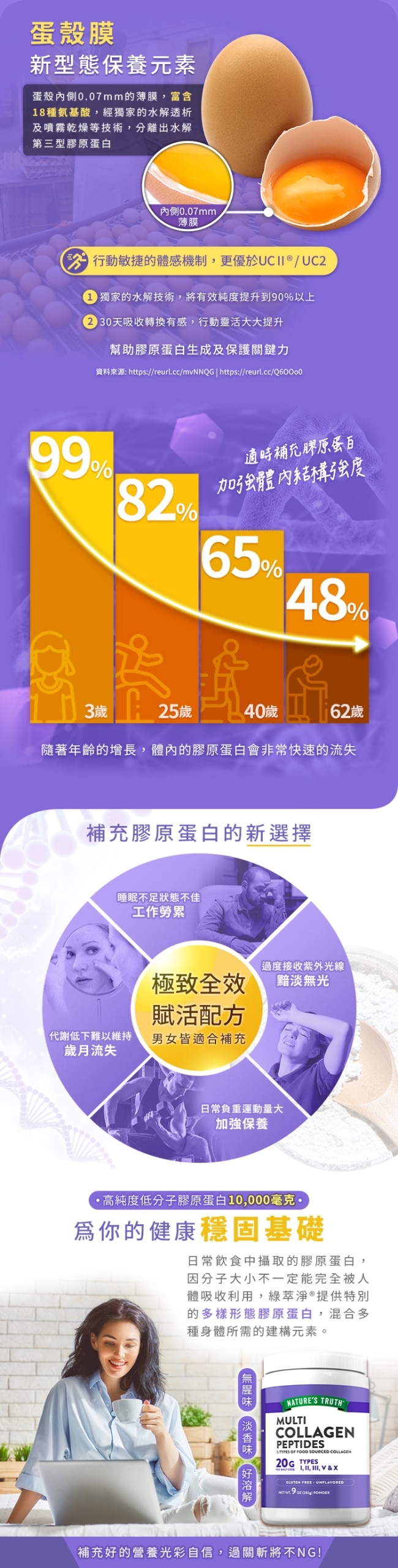 蛋殼內側0.07mm的薄膜富含18種氨基酸經獨家的水解透析及噴霧乾燥等技術分離出水解第三型膠原蛋白。