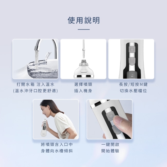 商品特色: 自動記憶水壓、三段水壓模式、按摩功能、4小時快速充電、強力脈衝水壓清潔效果好