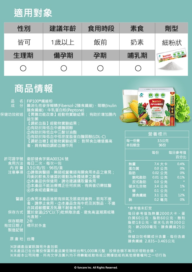 | 注意事項 | 食用本產品後若有排氣及脹氣現象不適者,請停止食用。 |