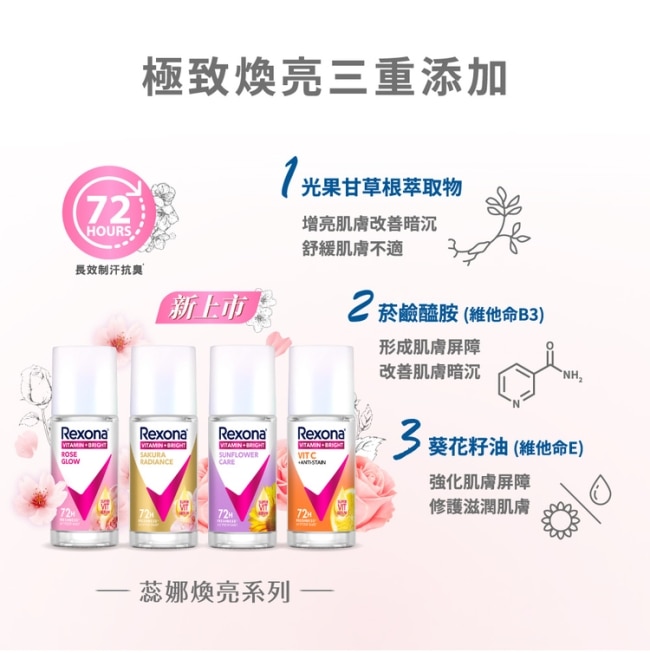 蕊娜煥亮系列富含抗氧化成分維他命E、B3以及維他命C專為滋養腋下肌膚而設能有效提亮膚色減少暗沉現象讓腋下肌膚保持明亮、光滑。這些成分不僅能深層滋養還能提供持久的抗氧化保護讓你的腋下肌膚看起來更加健康和有光澤。