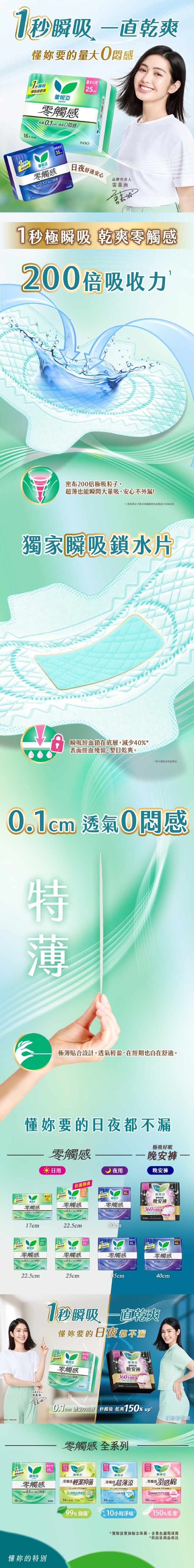 | 商品簡述 | 日本獨家 瞬吸鎖水片 1秒極瞬吸 乾爽零觸感 0.1cm特薄貼合設計 透氣0悶感 |