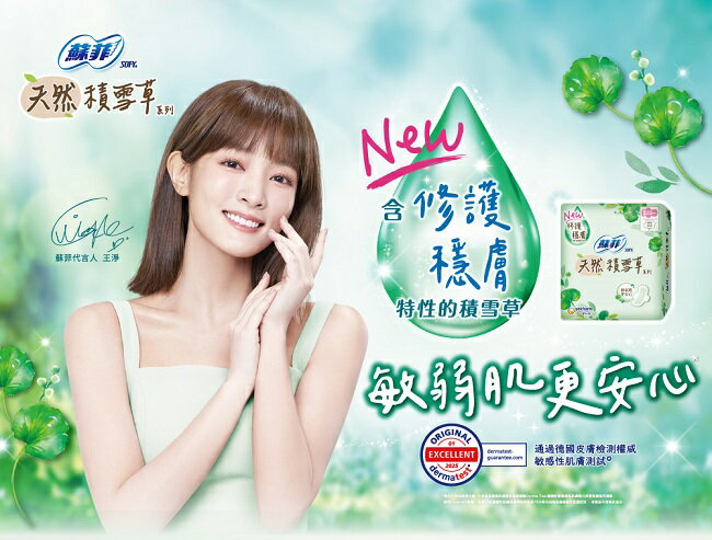 蘇菲天然積雪草衛生棉系列添加含修護穩膚的積雪草精華