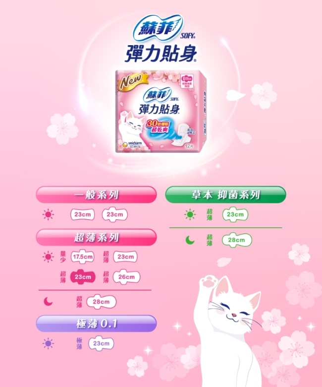 蘇菲彈力貼身超薄日用潔翼23cm12片2包+26cm4片