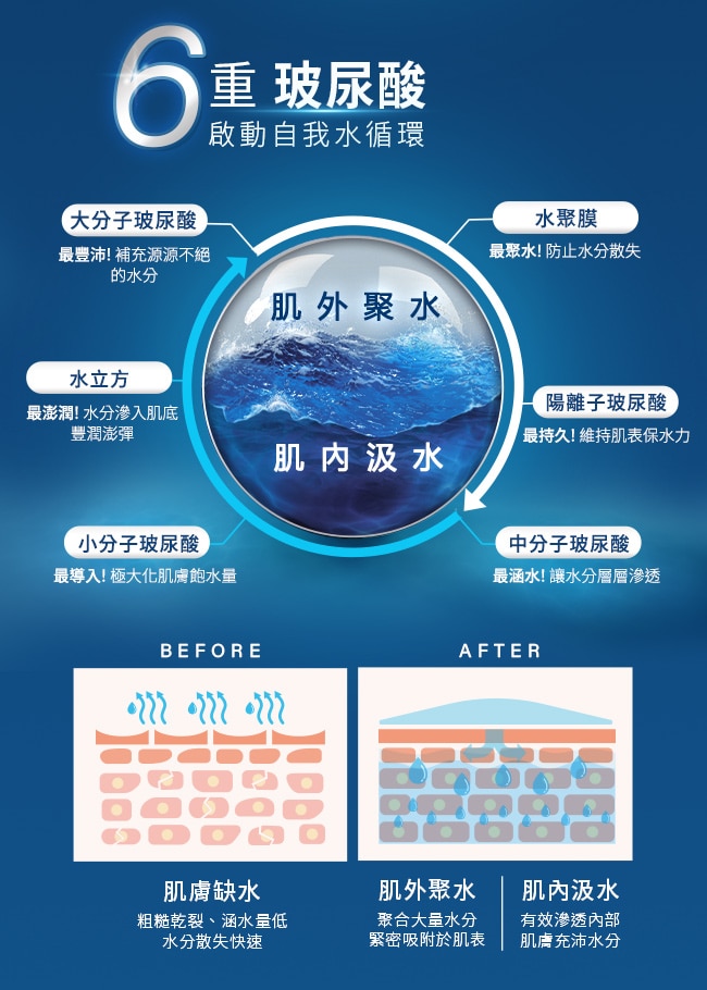 6-4-2 超導擬膚配方玻尿酸x神經醯胺x維他命B3+B5模擬肌膚生態啟動自我水循環肌外聚水、肌內汲水無間隙全面涵水重現豐、潤、透、亮水潤光采。