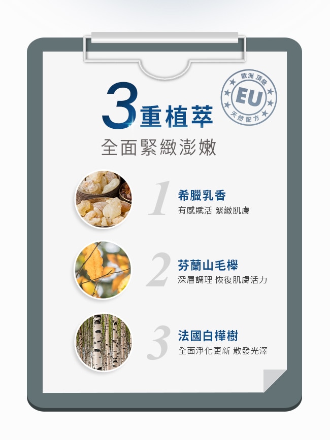三重歐洲珍稀植萃希臘乳香x芬蘭山毛櫸x法國白樺樹富含胺基酸、維生素等活膚因子。賦活、調理、更新肌膚緊緻澎嫩呈現健康狀態。