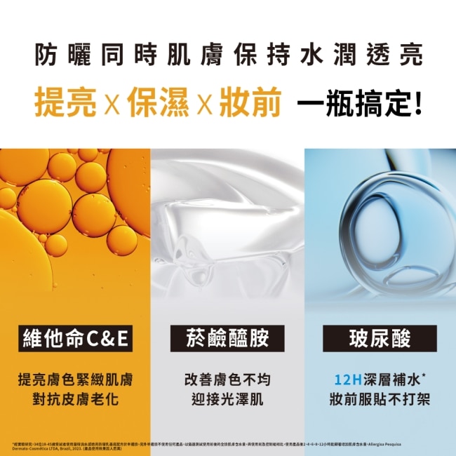 經皮膚測試。含 Helioplex SL™ 技術可有效抵禦 UVB、UVA。富含維生素 C和E、菸鹼醯胺和玻尿酸長期使用有助於對抗因日曬和環境侵害引起的肌膚老化問題。讓肌膚更緊緻、更光滑、更顯年輕。
