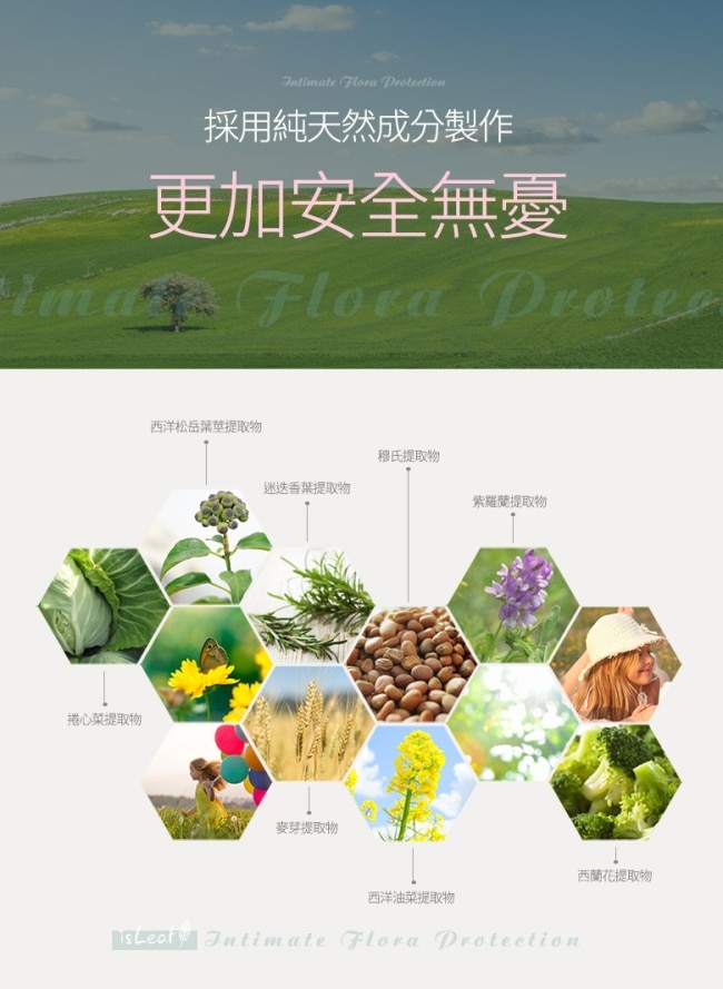 添加多種植萃成份:迷迭香可以減緩異味/金盞花可以舒緩肌膚乾燥發癢不適/山茶花補充水分/月見草萃取可以保濕滋潤/洛神花萃取具有維生素C 含有花果成份、8種花水成分