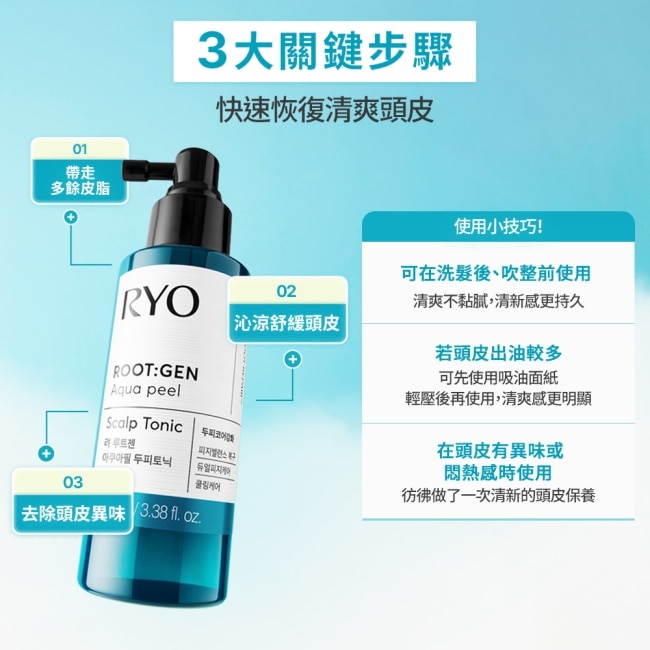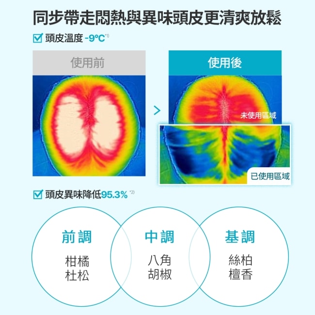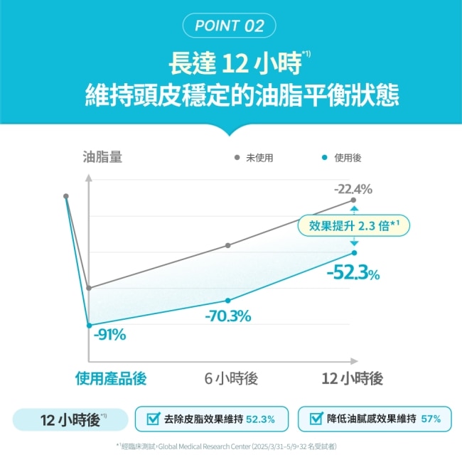 臨床證實,使用後油脂量減少91%,12小時油水平衡管理,老廢角質去除63.8%,頭皮溫度-9°C,頭皮異味去除率95.3%,相較其他產品提升2.3倍皮脂控制力