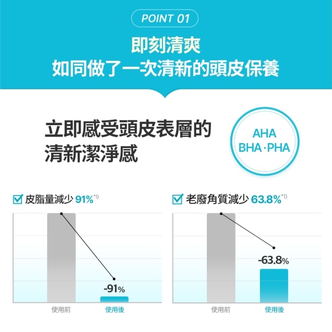 1. 即刻帶走頭皮多餘油脂,使用後油脂含量下降91%