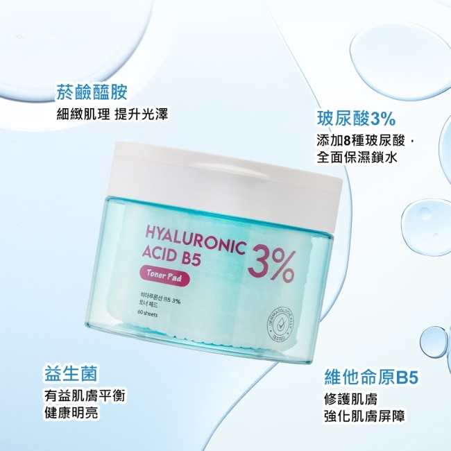 溫和角質調理與快速保濕修護肌膚的爽膚棉添加8種保濕玻尿酸、穩膚維他命B5與菸鹼醯胺等舒緩保濕亮白成分使肌膚恢復水嫩彈力修護肌膚屏障散發透亮光澤。適合局部乾燥、重要場合前、妝前保養、天天使用亦可。