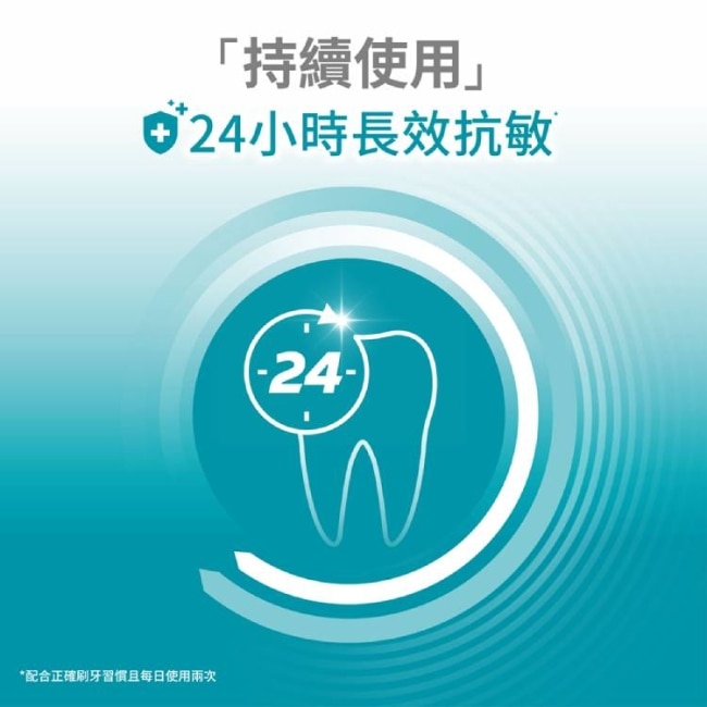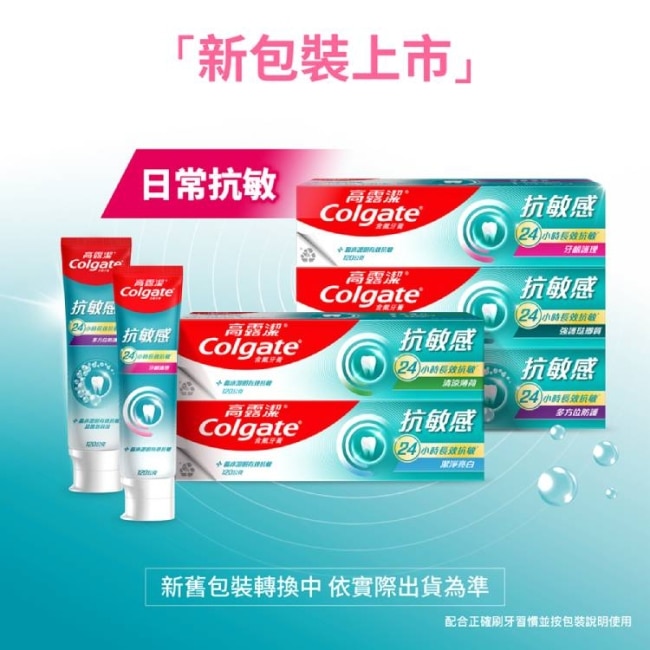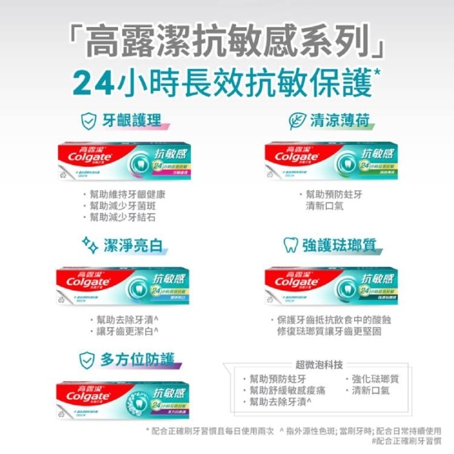 1. 高露潔®抗敏感系列牙膏,專為敏感性牙齒設計配方,強健牙齒對抗敏感。實驗證明經常使用可提供24小時抗敏感保護*,有效幫助舒緩敏感性酸痛。