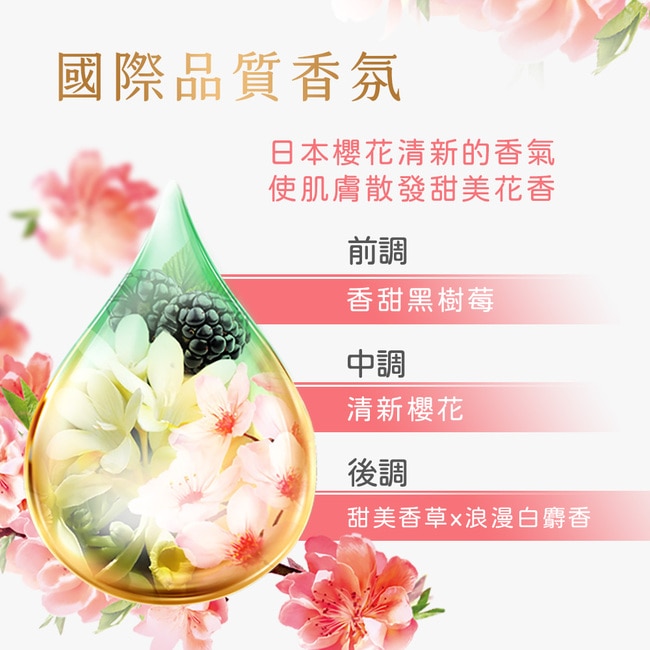 | 商品簡述 | 日本櫻花清新的香氣搭配維他命B3注入 使肌膚水嫩透亮 散發甜美花香 |