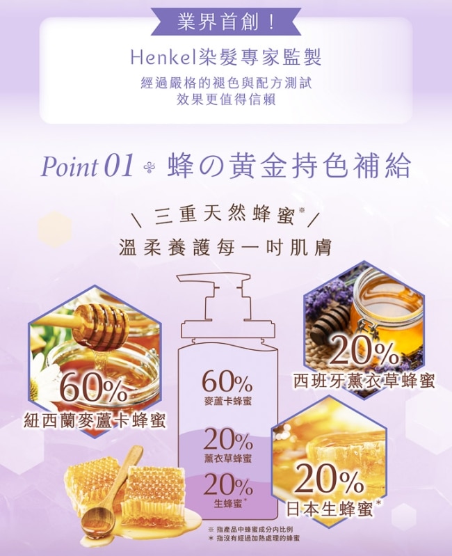 | 商品簡述 | 使用蜂蜜和染髮護理成分來保持新染顏色的護髮產品。含有賦予光澤的著色成分。法國薰衣草蜂蜜的味道。 |