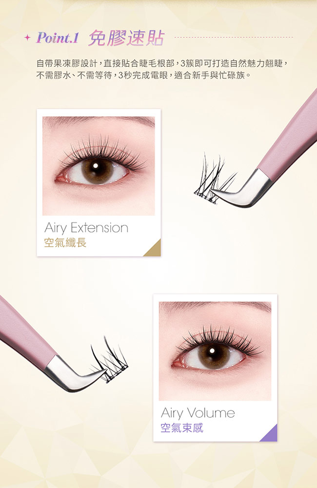三段式自帶果凍膠,免膠免卸不傷睫毛,柔軟無梗超舒適,輕鬆貼合輕盈上眼。