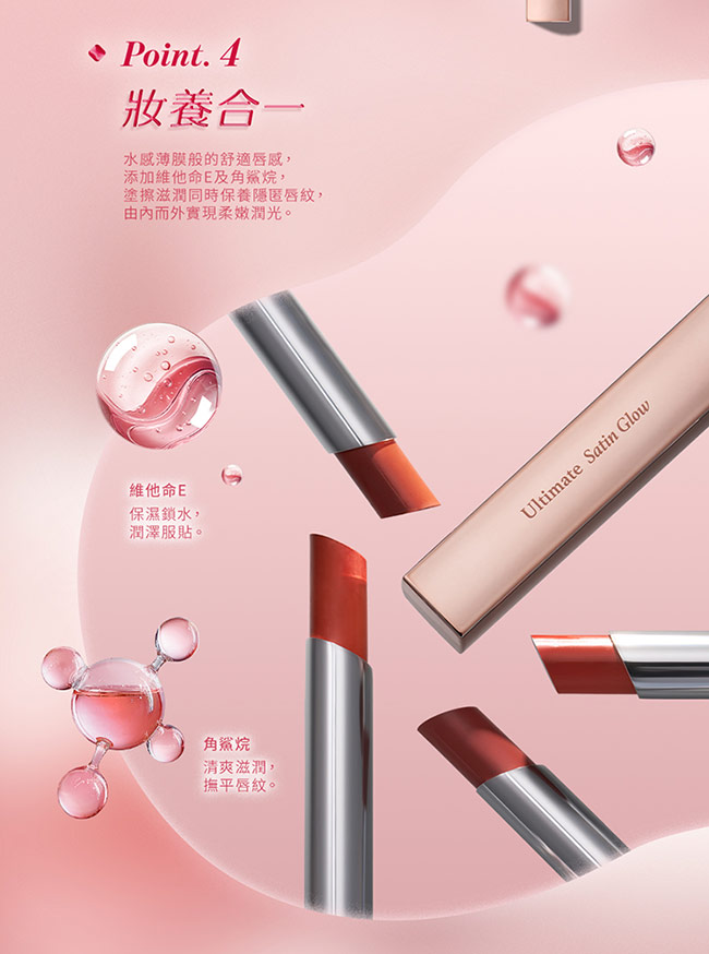 絲絨般的柔滑質地輕盈包覆雙唇高濃度持色配方一抹即現鮮明色彩添加維他命E及角鯊烷飽滿水嫩綻放極潤緞光。