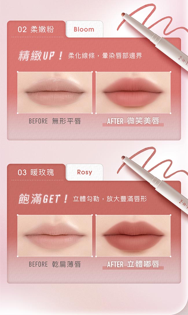 1028 雙管齊下柔霧唇線筆 01 大地裸.02 柔嫩粉.03 暖玫瑰