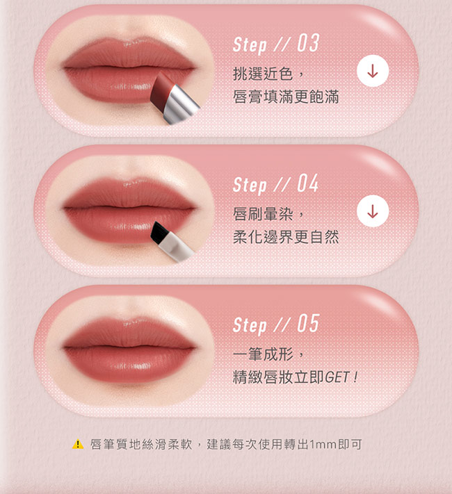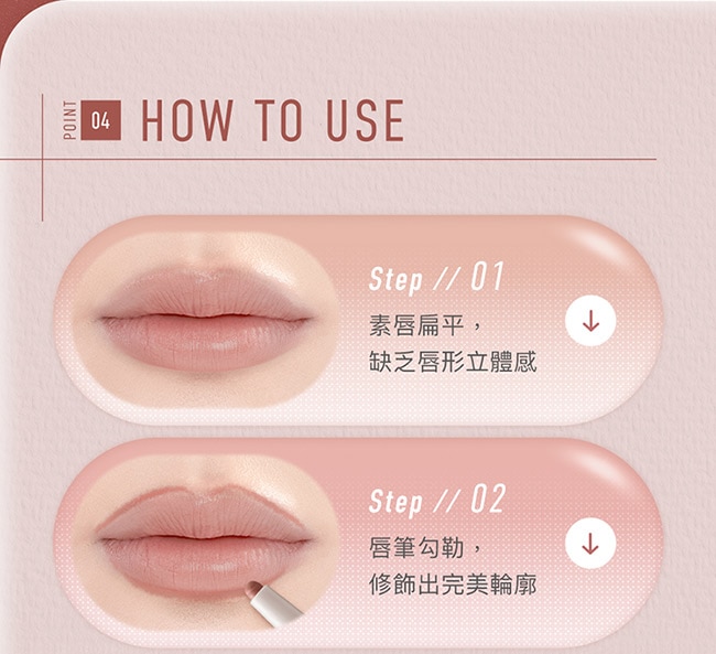 絲滑柔霧質地滑順輕柔不拉扯精準勾勒唇周輕鬆塑造立體唇形。