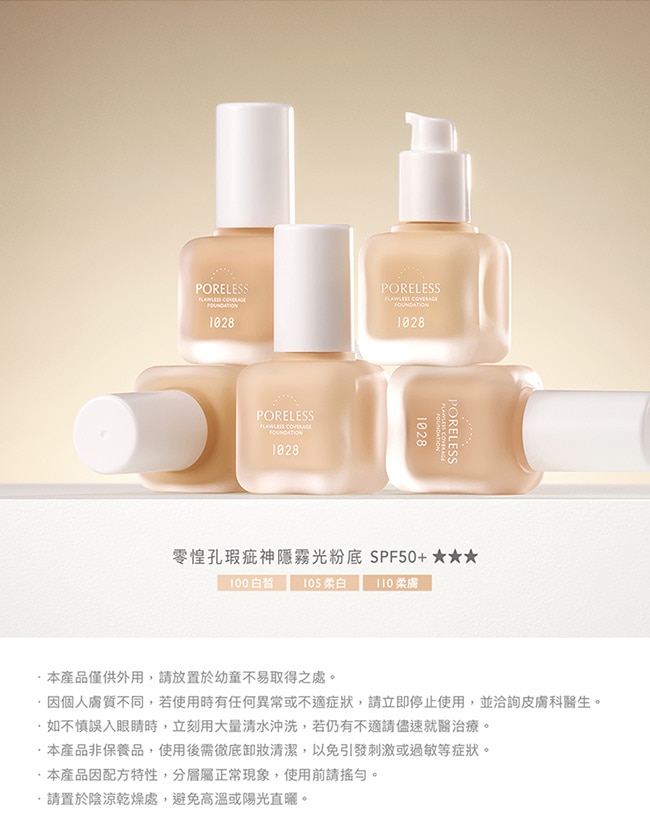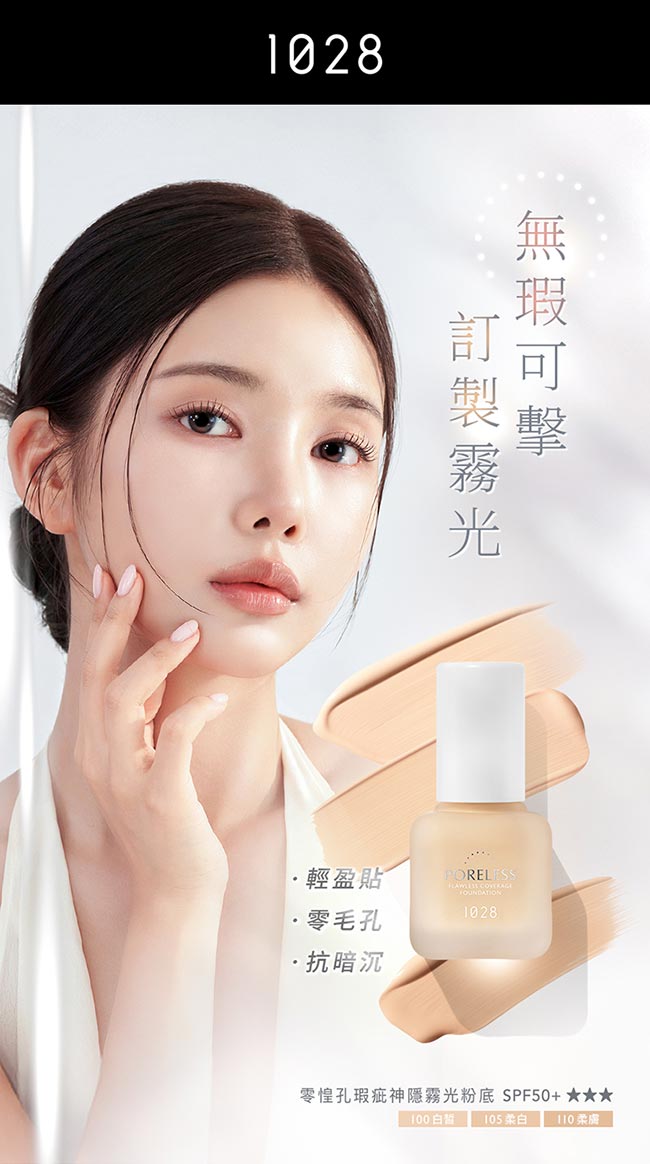1028 零惶孔瑕疵神隱霧光粉底SPF50+ 100白皙/105柔白/110柔膚