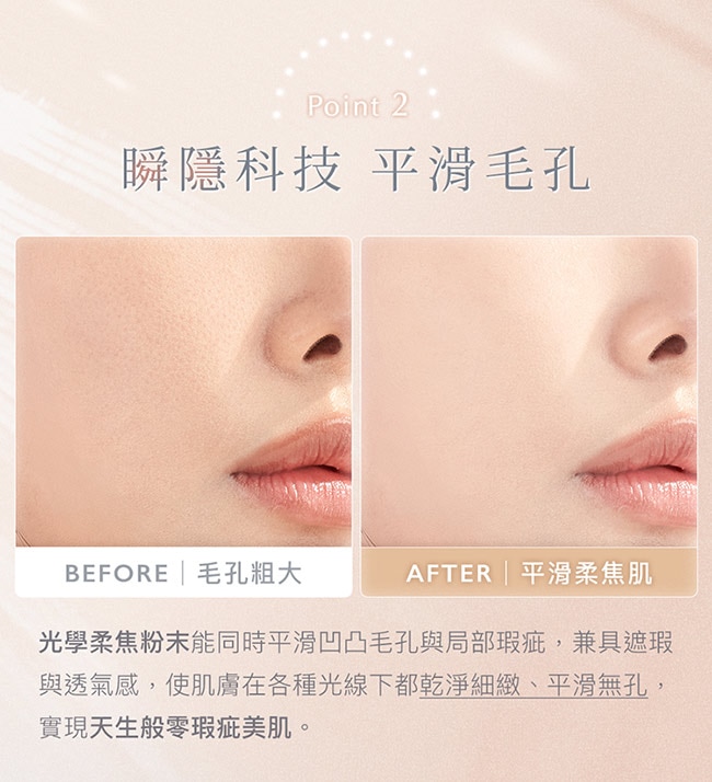 高效遮瑕同時柔焦毛孔,實現天生般零瑕疵美肌。