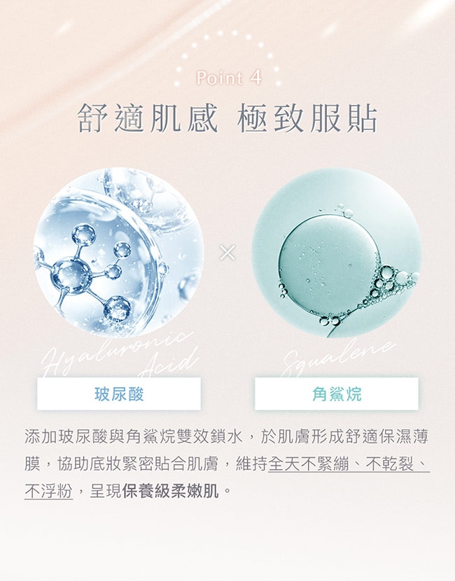 玻尿酸、角鯊烷保濕成分,全天維持肌膚舒適保水,不緊繃不乾燥。