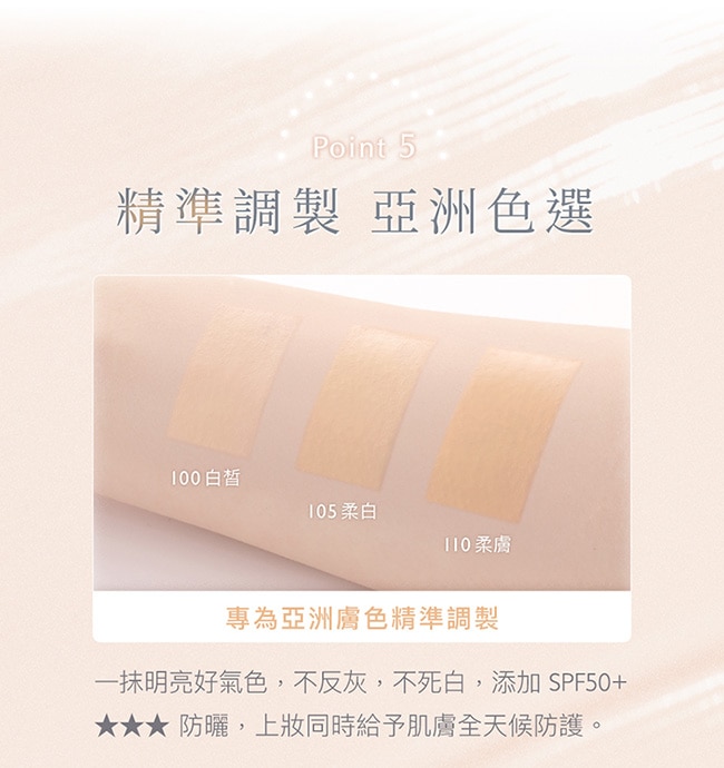 SPF50+防曬添加,上妝同時給予肌膚全天候防護。
