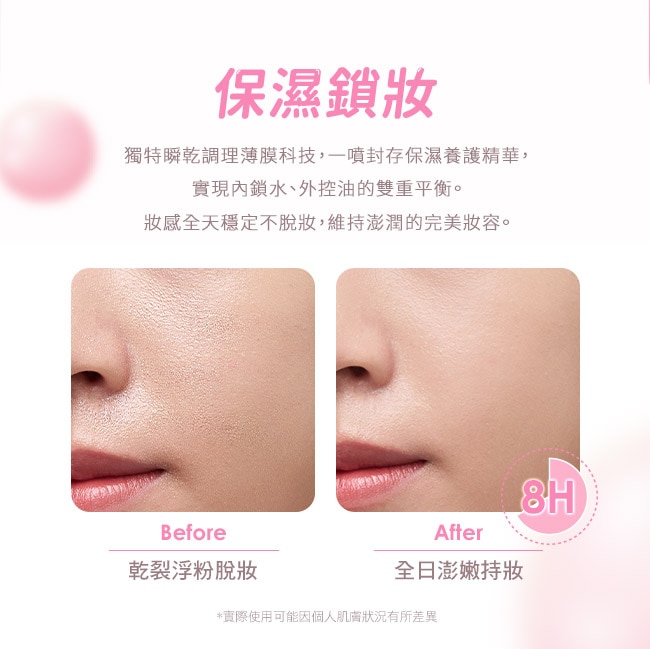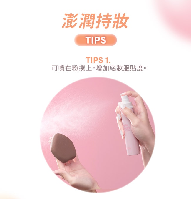 細緻水霧一噴成膜緊鎖妝容不脫妝。添加膠原蛋白與彈力胜肽澎潤定妝同時為肌膚充分補水不浮粉不脫屑全天維持彈嫩透亮美肌。
