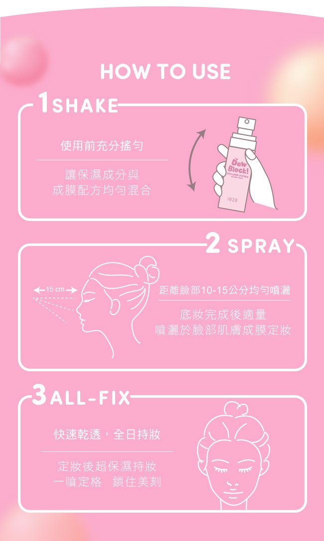 用法使用前請先充分搖勻3~5次。妝容完成後將噴霧距離臉部10-15cm適量均勻噴灑於臉部肌膚。