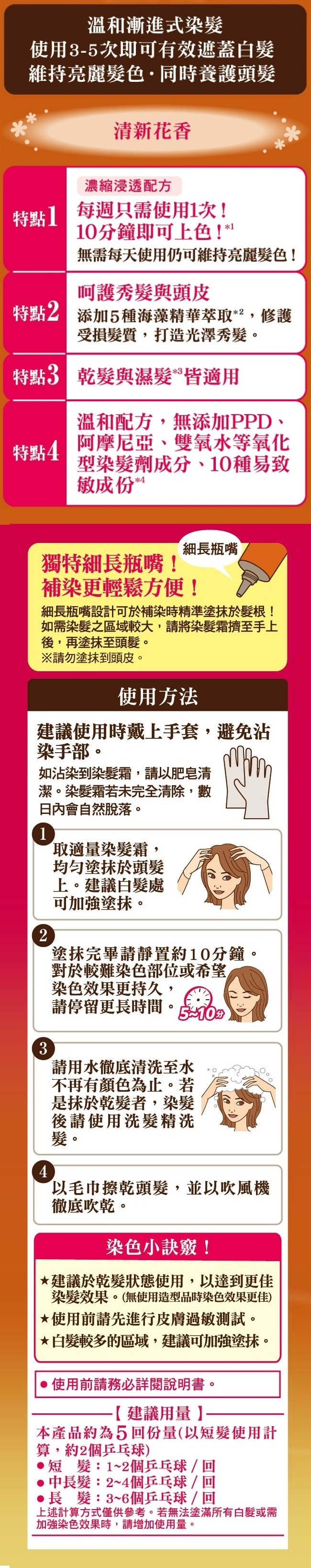 | 商品簡述 | 健康染髮, 添加5種海藻精華,溫和漸進式上色 |