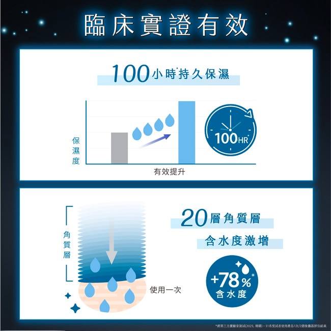 肌膚含水度激增+281%*、蘋果肌飽水澎潤度立即+12.4%*、長效保濕達100小時*