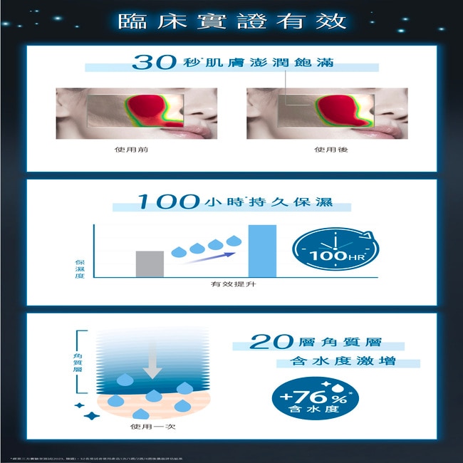 肌膚含水度激增+281%*、蘋果肌飽水澎潤度立即+12.4%*、長效保濕達100小時*