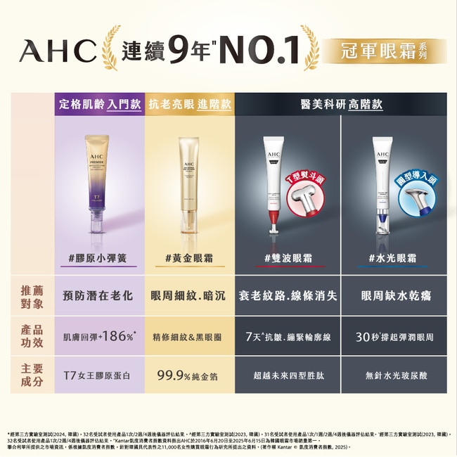 | 商品簡述 | AHC T7女王膠原彈嫩撫紋全臉眼霜 立體顏線感 X 精雕幼態肌 |